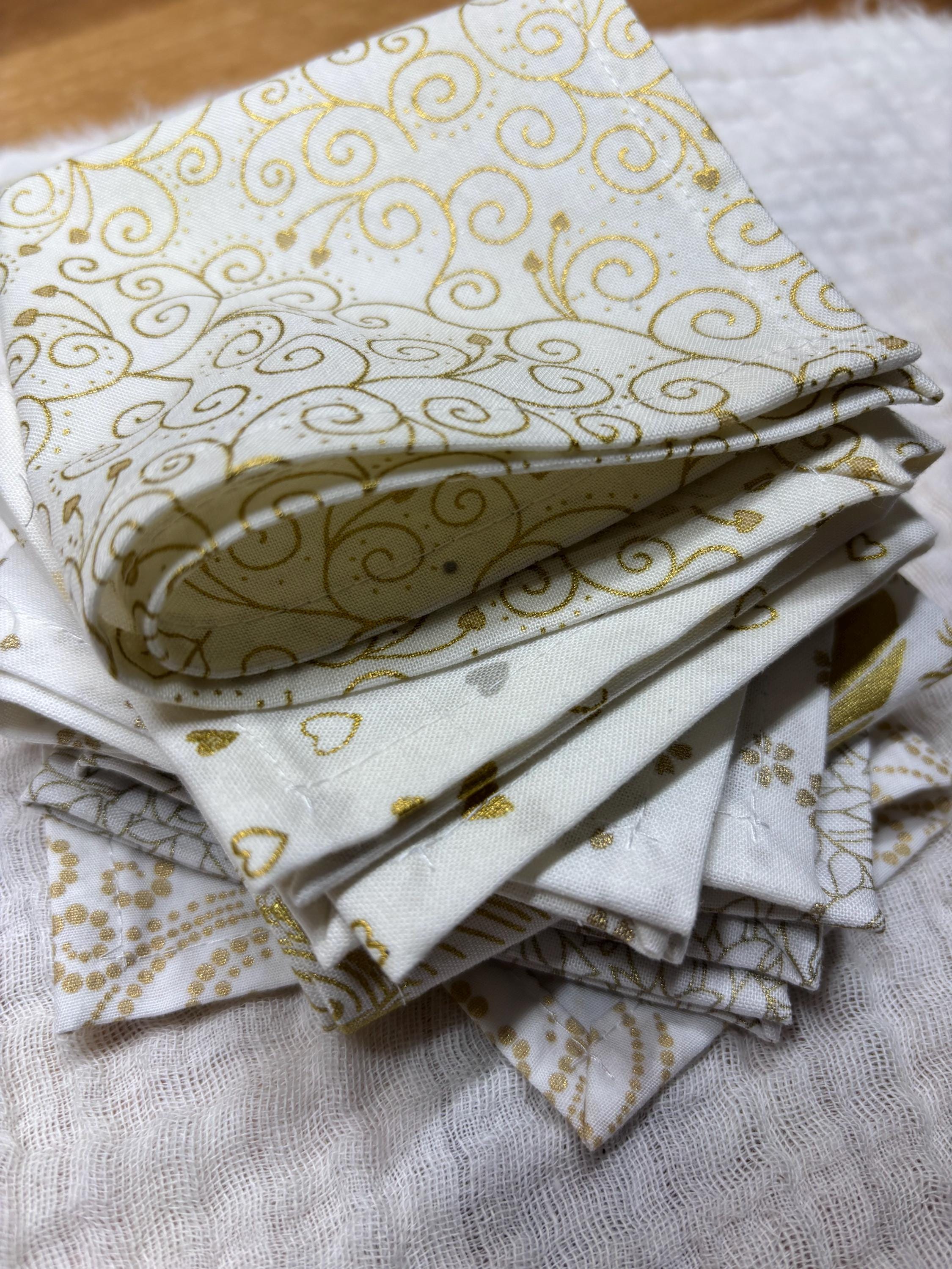Napkins are professionally made with finished edges. They're hand turned, double rolled and stitched with mitered corners.