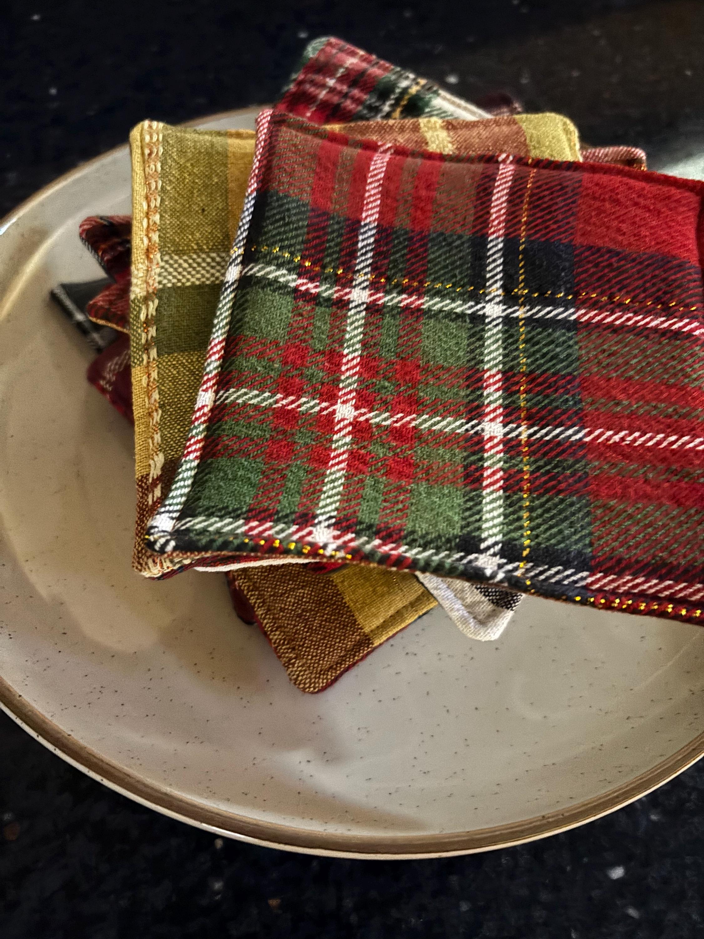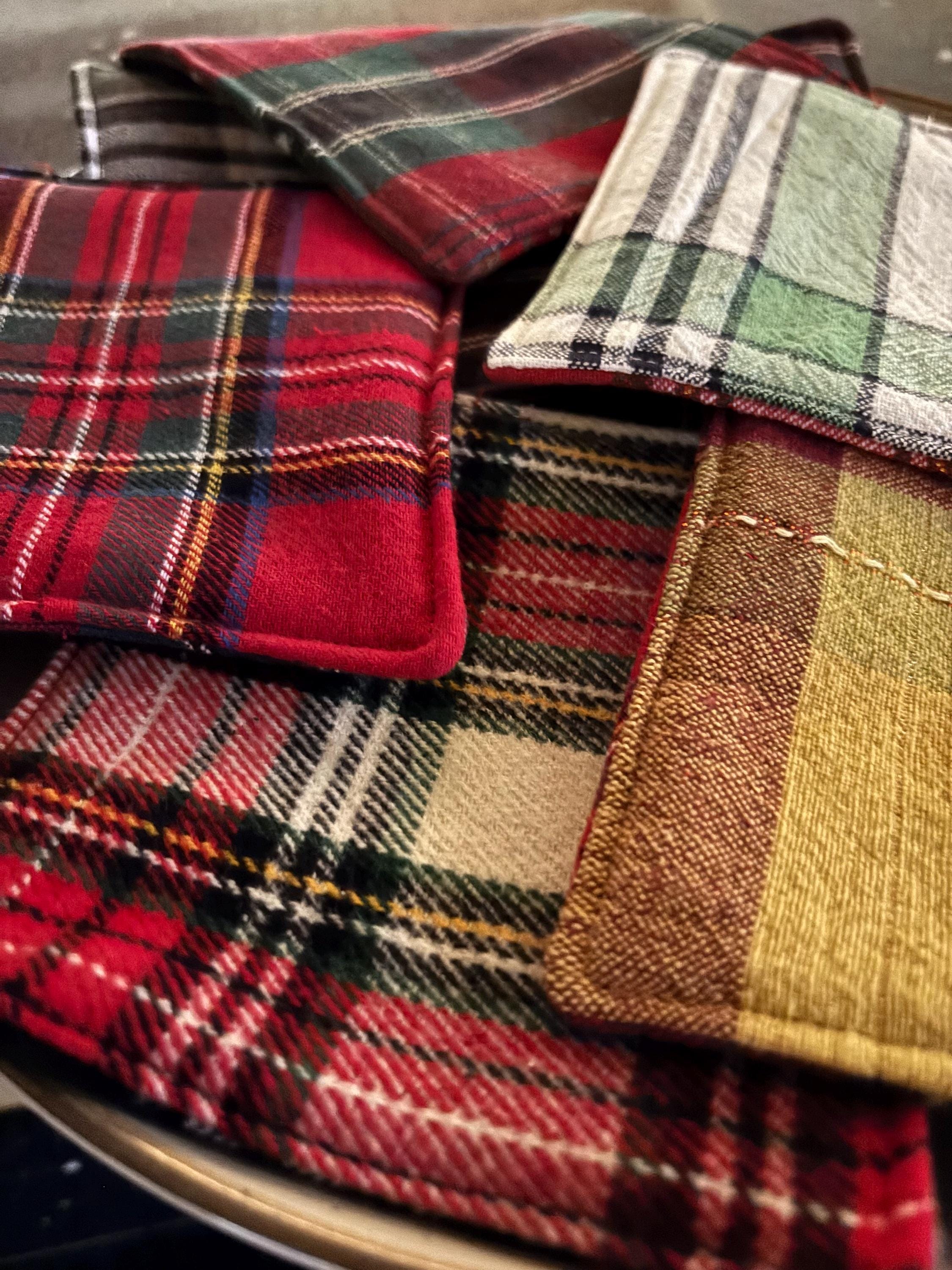 Each fabric coaster is made with two fabrics with a layer of batting sewn between the two fabric pieces. Each side has a different plaid fabric.